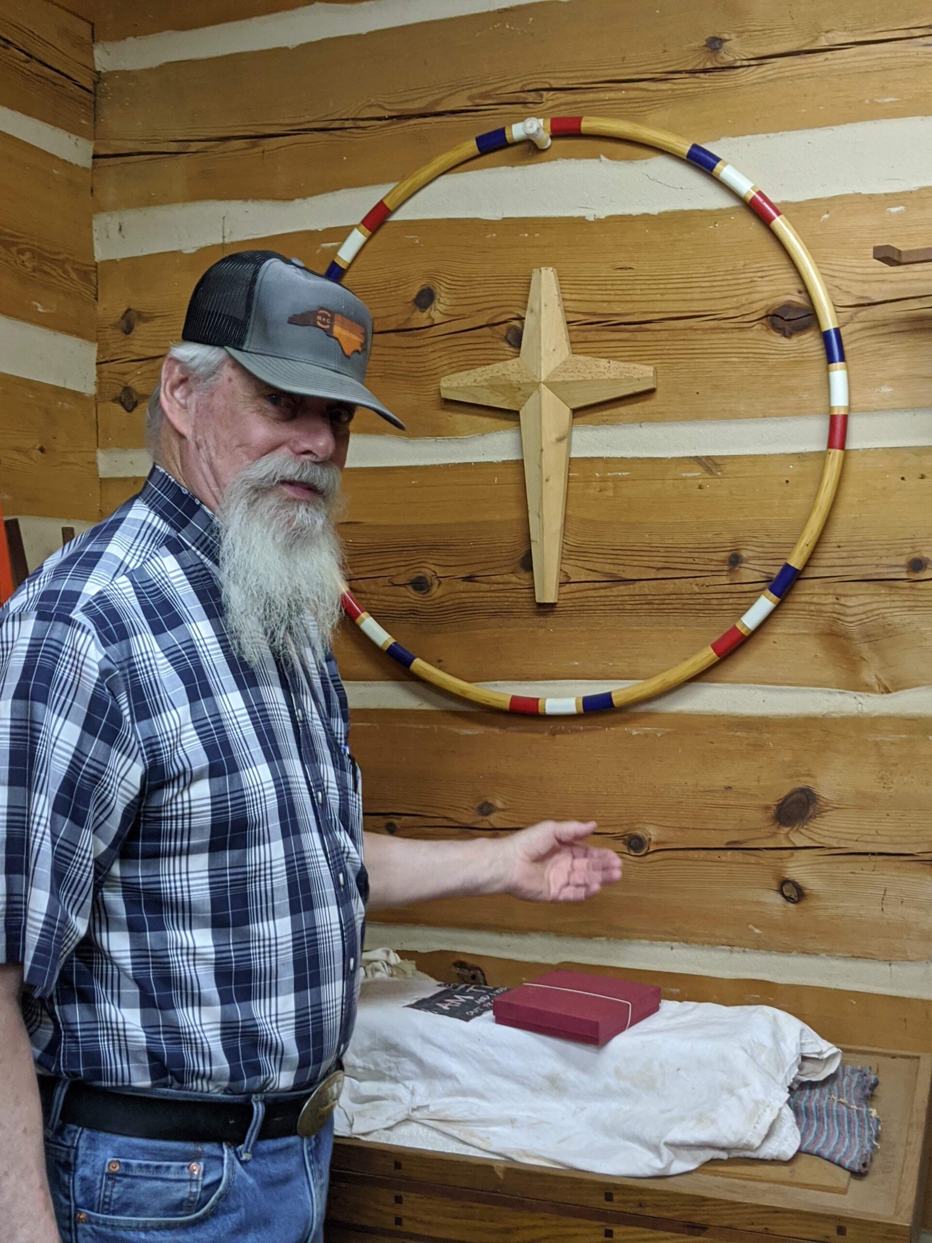 He cut the 2×4 into 1/8″ strips and scarf jointed them. The center is hollow. This 36″ around Hula Hoop was made without a pattern. Bob said, “I knew how to do it the minute I thought about it”